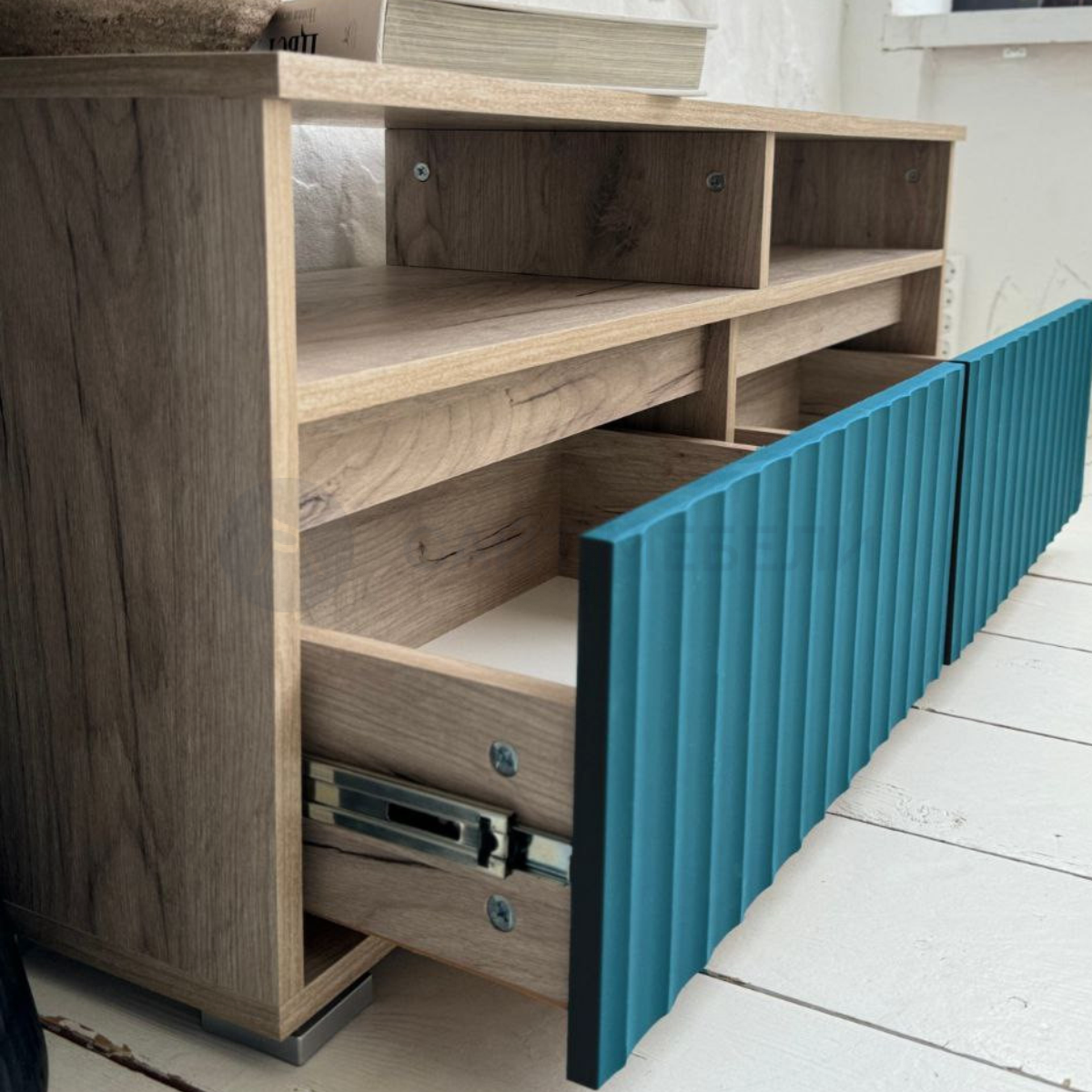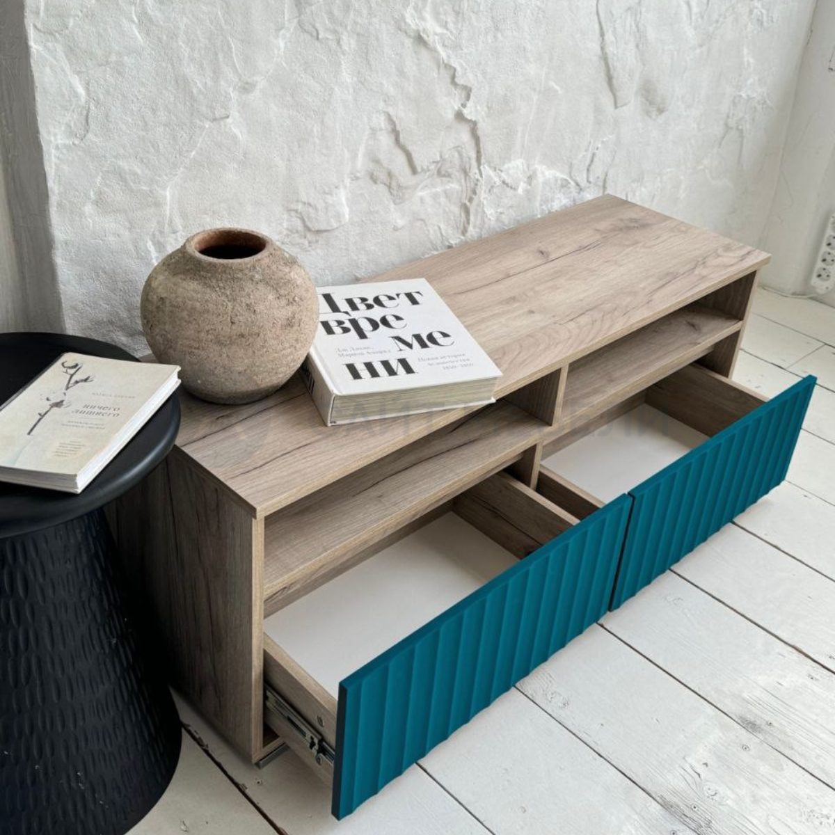 Хранение: Модель оснащена двумя открытыми нишами для техники и двумя выдвижными ящиками на надежных шариковых направляющих, обеспечивающих плавный ход.