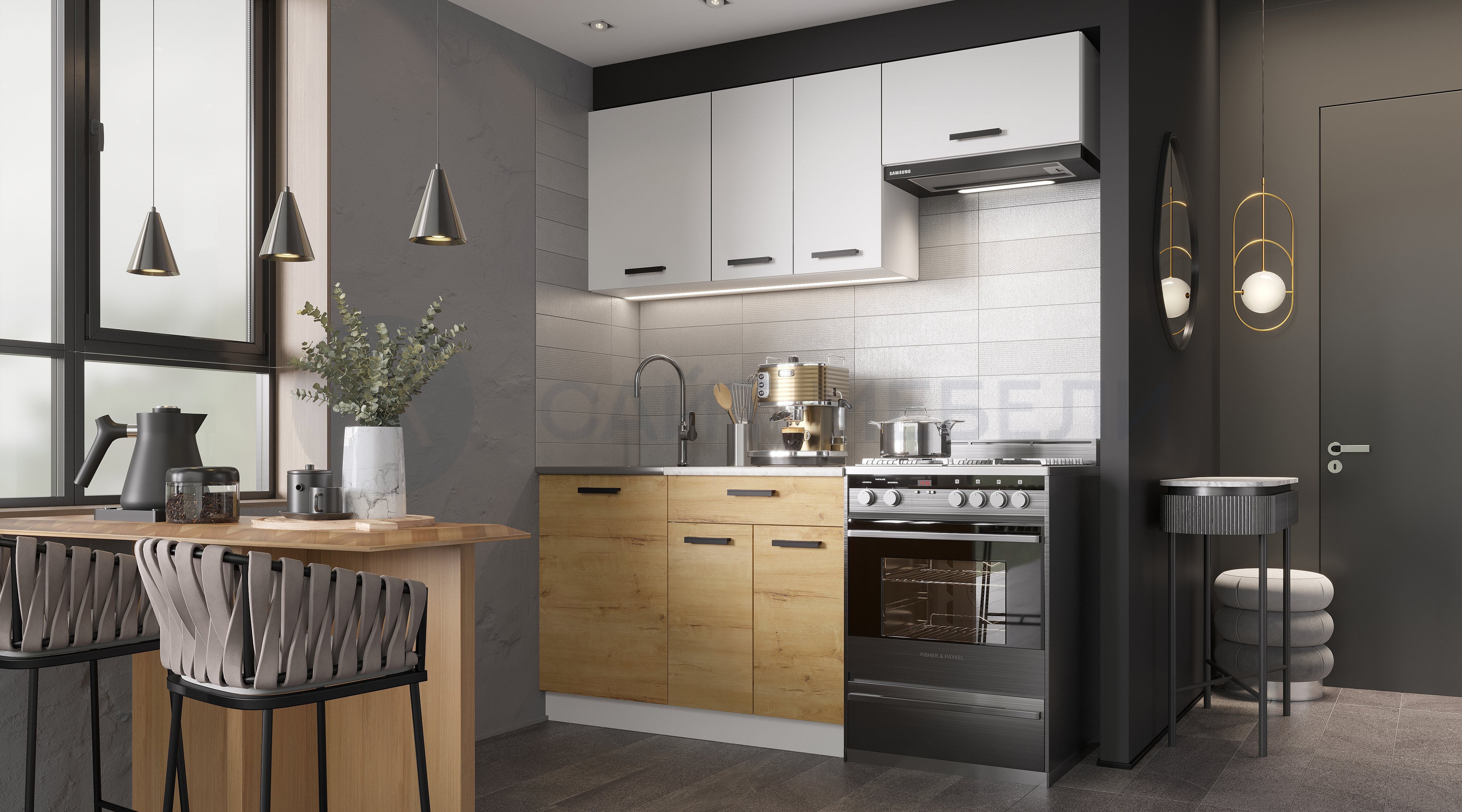 - высота общая 206 см, нижние шкафы 80,6 см (со столешницей 83,2 см), верхние шкафы 62,6 см.