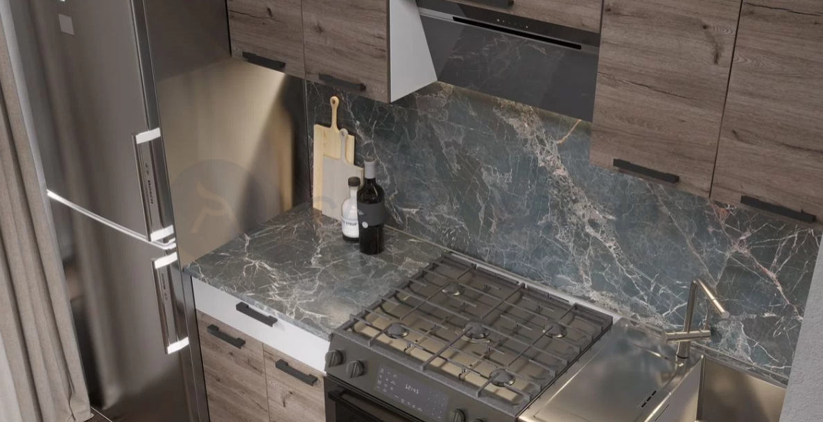 В комплект не входит мойка, смеситель, стеновая панель и техника.
