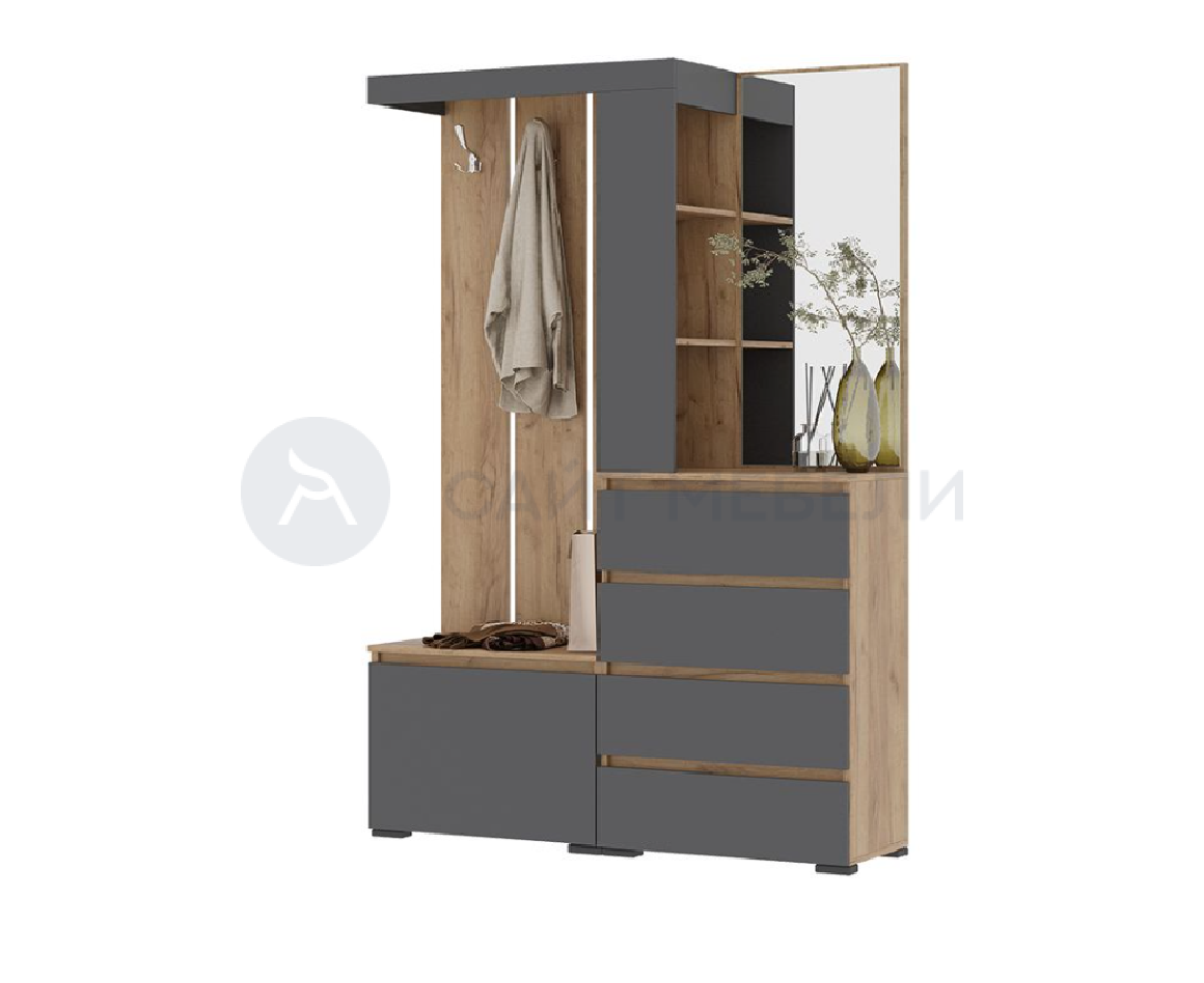 Комплектация прихожей Хельга включает в себя: комод, зеркало, 4 выдвижных ящика с шариковыми направляющими полного выдвижения, удобные боковые полочки для мелочей (со стороны зеркала), закрытую обувницу и открытые крючки для верхней одежды.