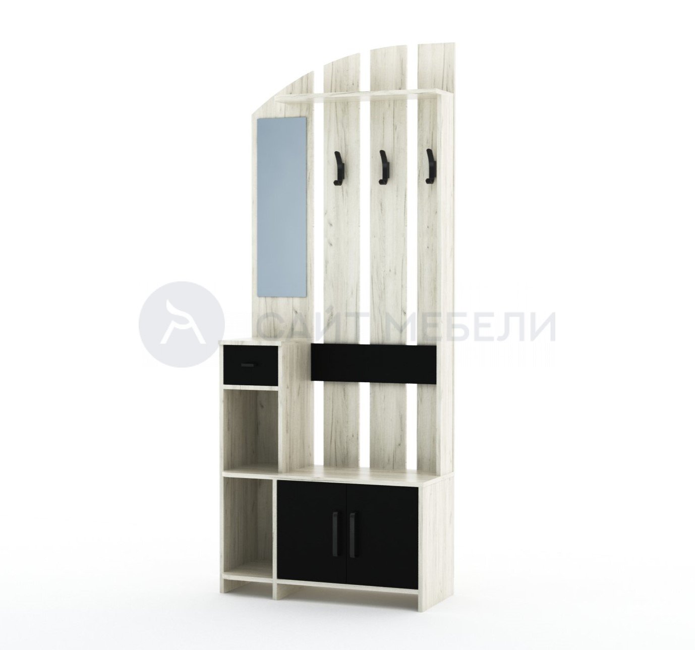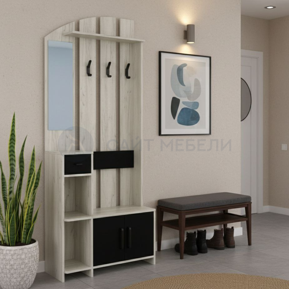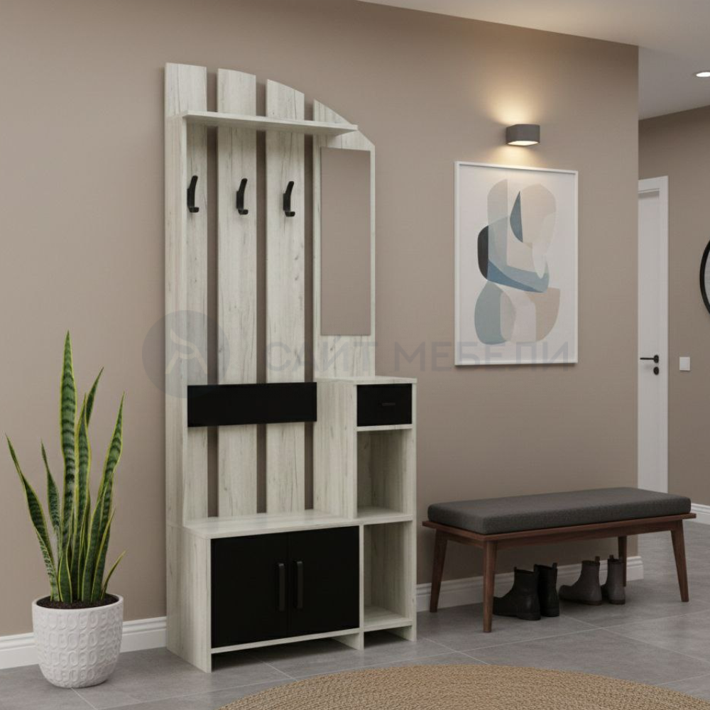 Готовый гарнитур в прихожую с зеркалом, вешалкой, тумбой, открытыми полками и ящичком для мелочей.