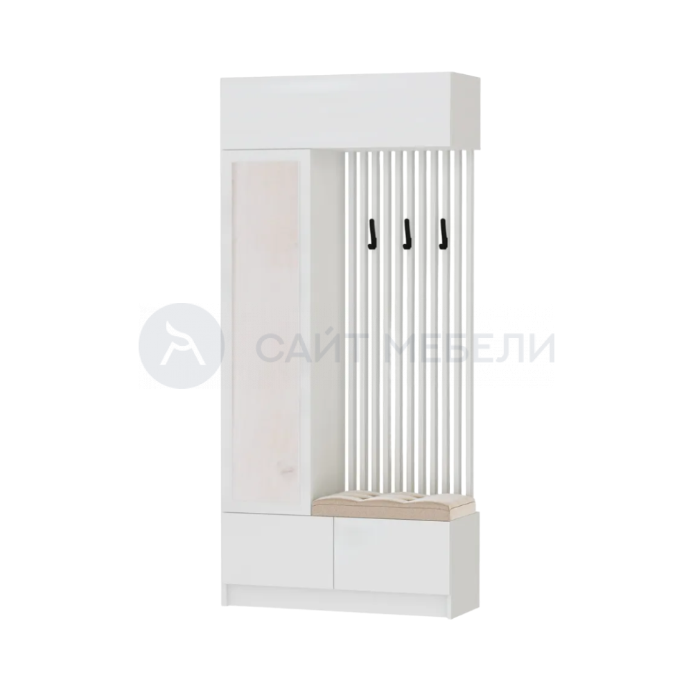 Центральная секция модульной прихожей Руэлла. На фасадах отсутствует лицевая фурнитура. Мягкое сиденье в комплекте.