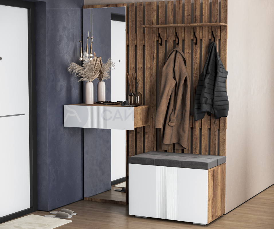 Состав комплекта: зеркало с тумбой, вешалка, тумба под обувь , мягкая сидушка.