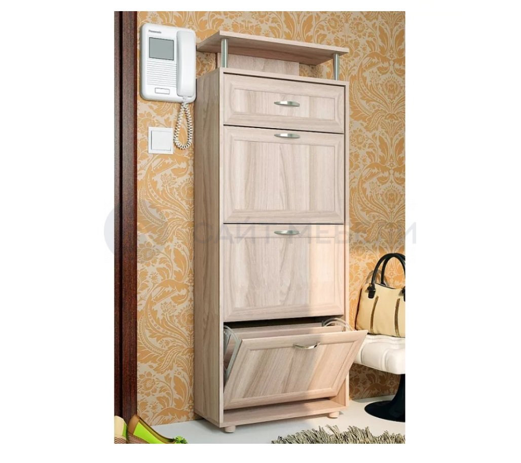 Наполнение: три откидные секции для хранения обуви, выдвижной ящик, регулируемые ножки-опоры.