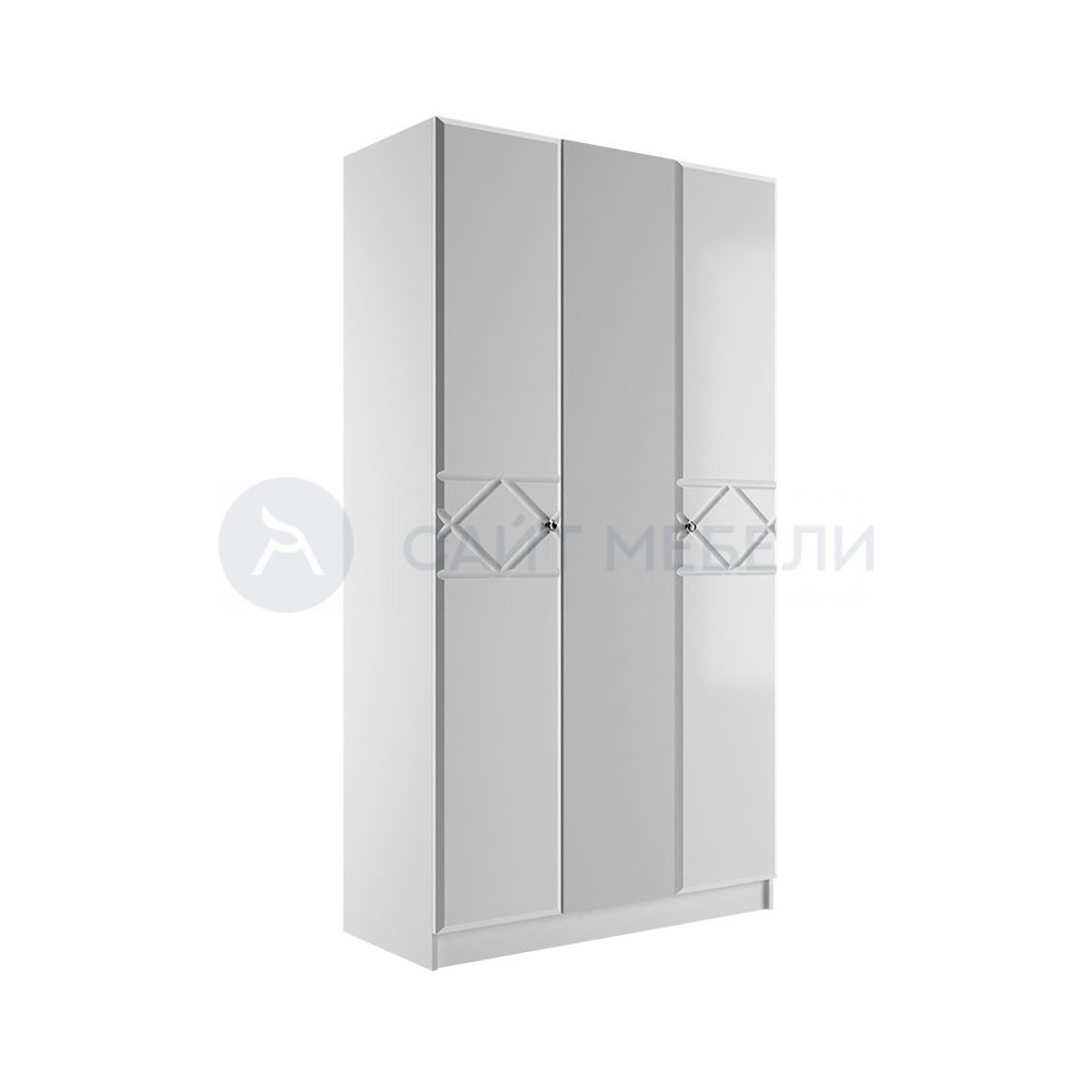 Распашной 3-х створчатый шкаф в спальню с белыми глянцевыми фасадами и зеркалом.