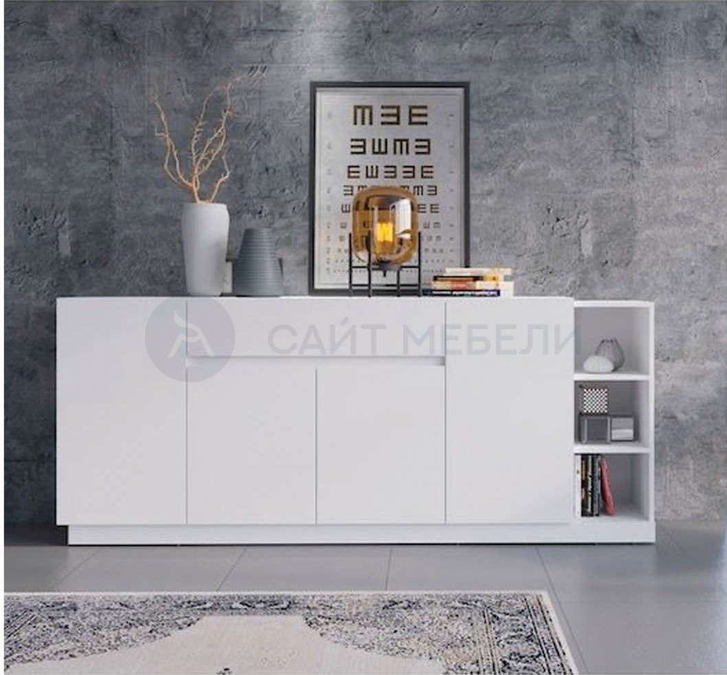 Вместительный комод-тумба с выдвижным ящиком и 4 шкафчиками с распашными дверками, а также открытыми полками.