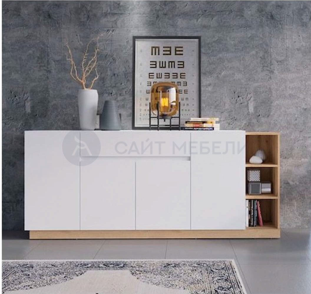 Вместительный комод-тумба с выдвижным ящиком и 4 шкафчиками с распашными дверками, а также открытыми полками.