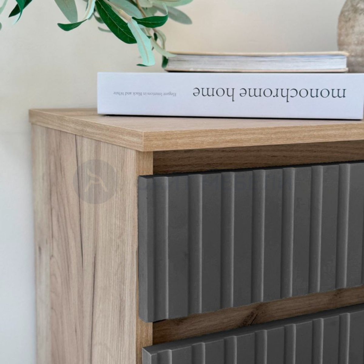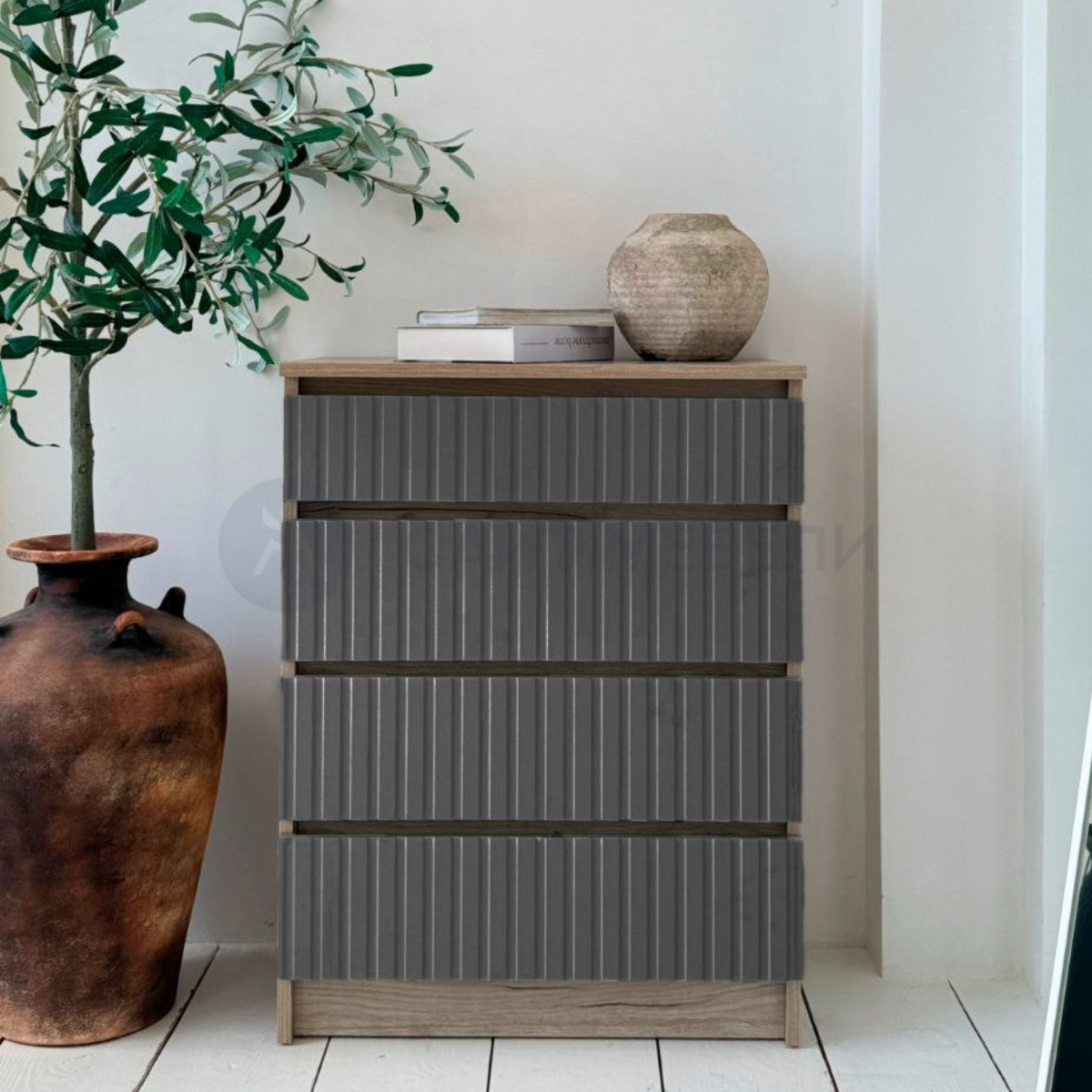 Комод подойдет для гостиной или спальни. Благодаря 4-м выдвижным ящикам комод позволит организовать порядок для любой комнаты. Лицевая фурнитура (ручки) на ящиках отсутствует, ящики выдвигаются за счет отступов между фасадами. На ящиках вертикальная фрезеровка.