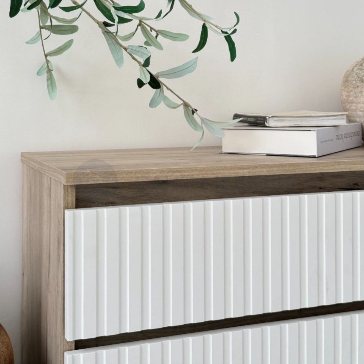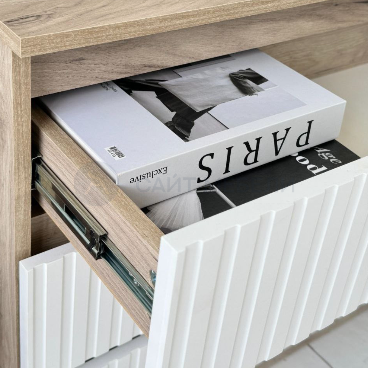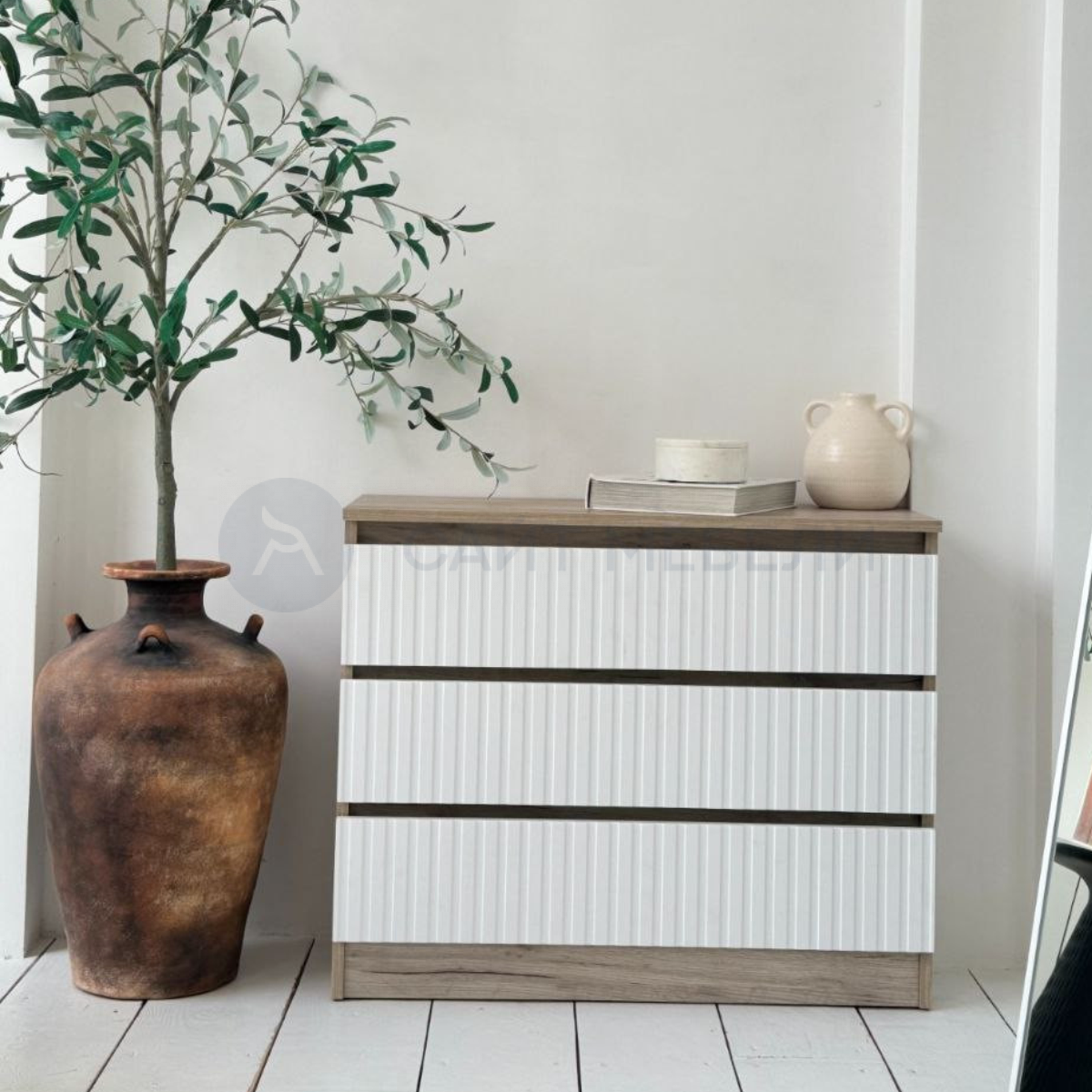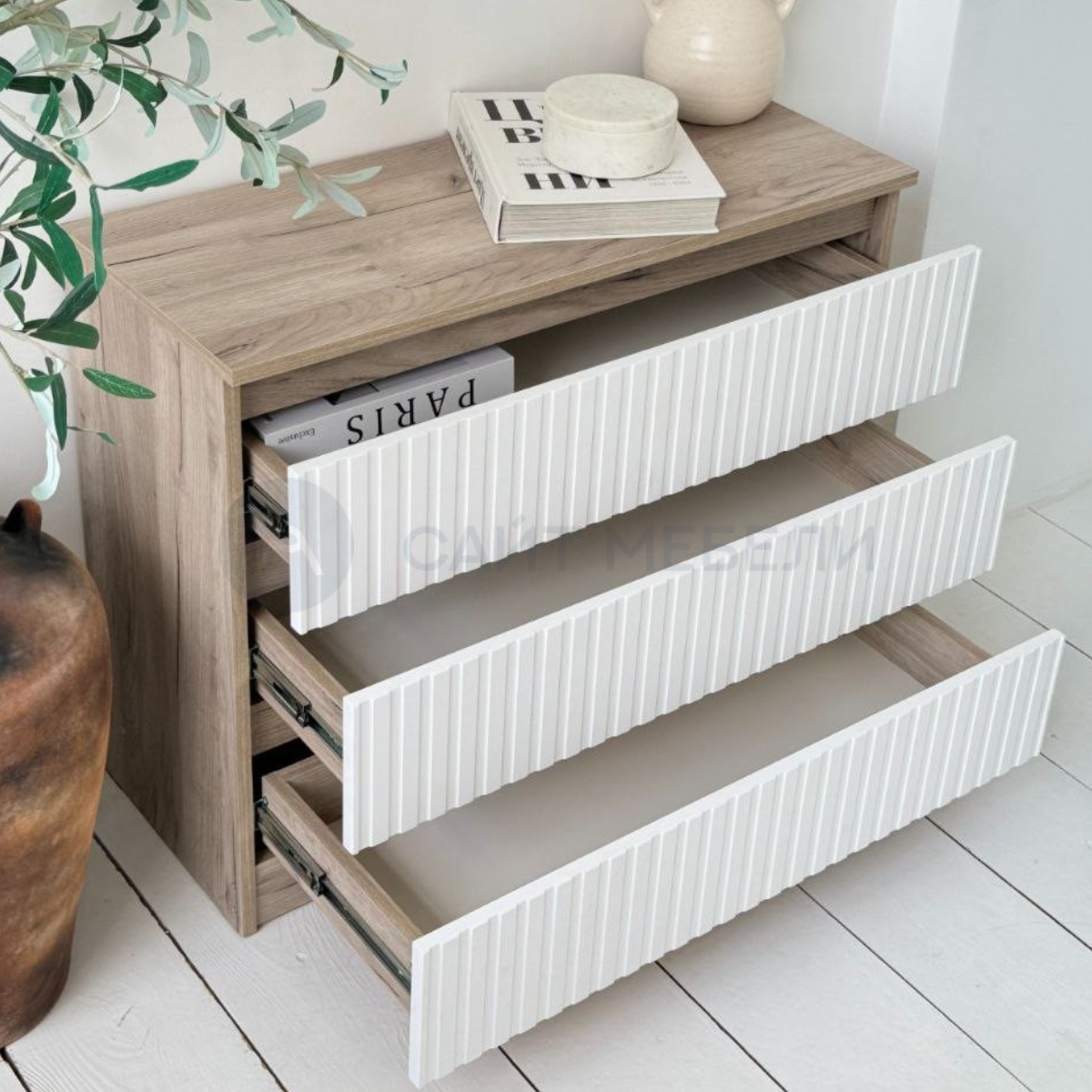 Комод подойдет для гостиной или спальни. Благодаря трем выдвижным ящикам комод позволит организовать порядок для любой комнаты. Лицевая фурнитура (ручки) на ящиках отсутствует, ящики выдвигаются за счет отступов между фасадами. На ящиках вертикальная фрезеровка.