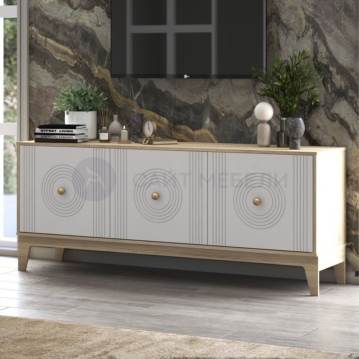 Комод-тумба с фасадами МДФ с современной фрезеровкой в виде вертикальных полос и кругов.