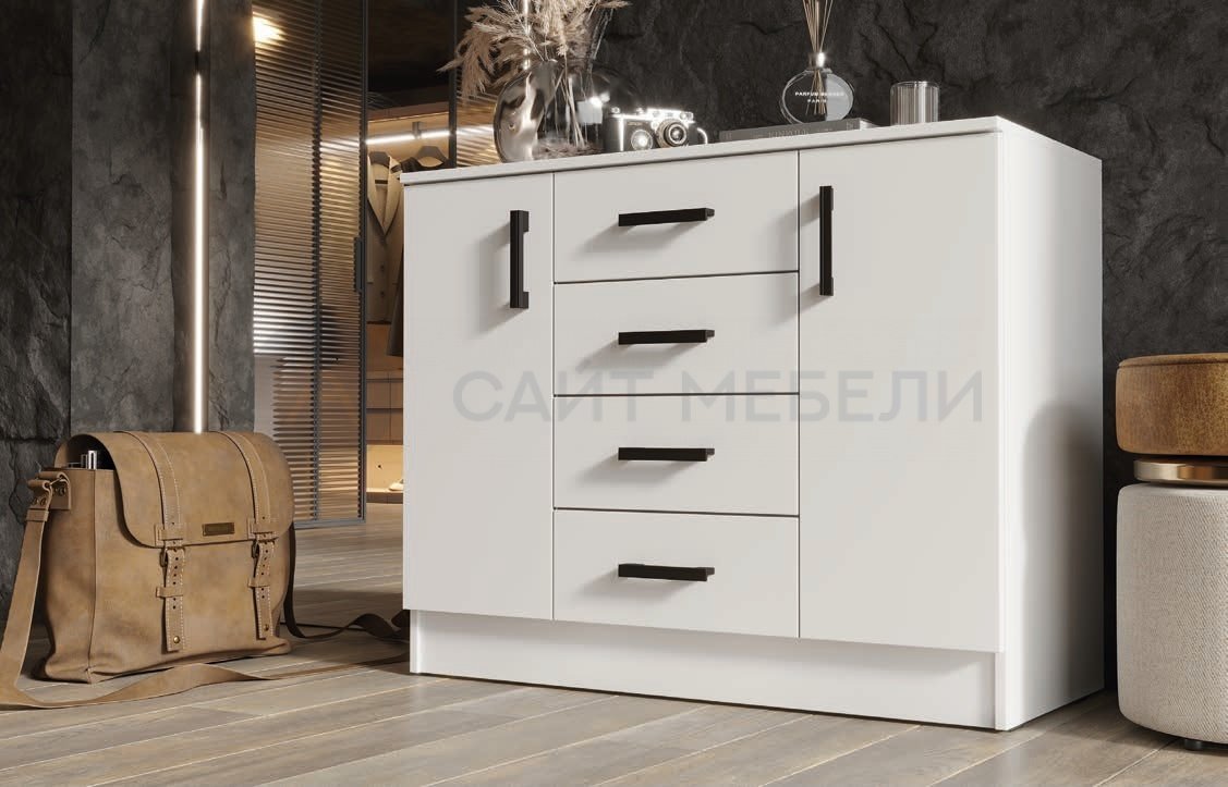 Комод с 4 выдвижными ящиками и 2 шкафчиками для хранения белья и вещей.