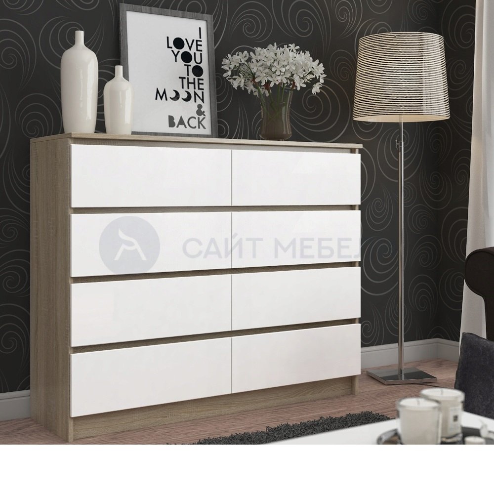 Комод в комбинированном цвете дуб сонома и белый матовый с 8 ящиками "без ручек".
