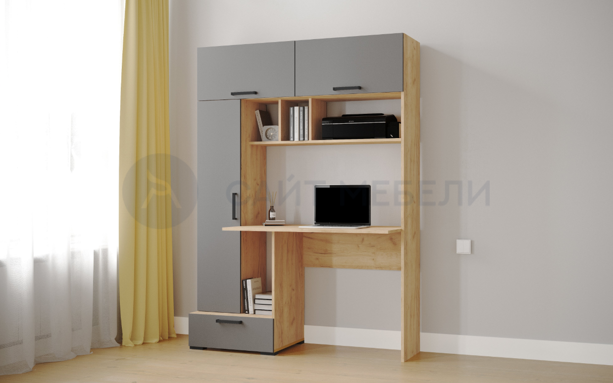 Компьютерный стол Квартет - 11 со шкафом с полками, выдвижным ящиком, открытыми полочками и горизонтальными шкафчиками в надстройке.