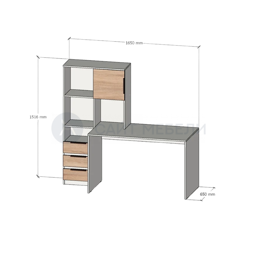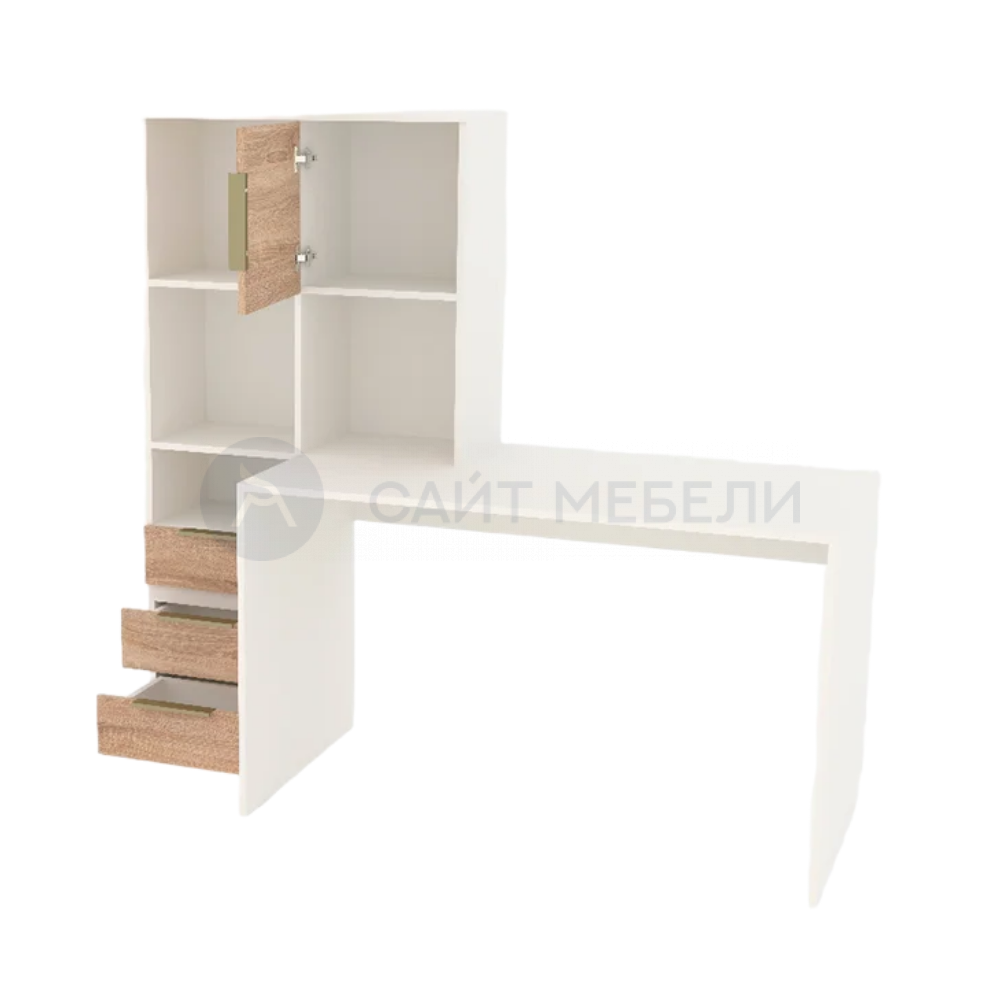 Письменно-компьютерный стол с 3 выдвижными ящиками, открытыми полками и дверкой.